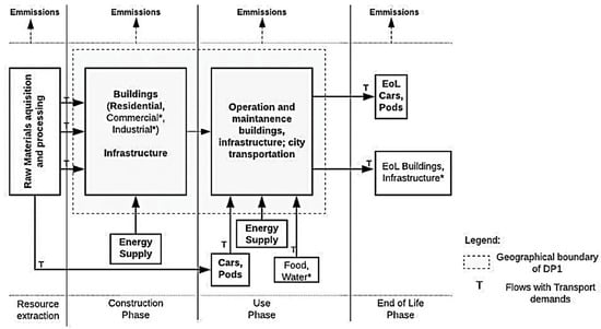 The aim of the LCA study was to perform a quantitative analysis of DP1 to identify the environmentally taxing processes present in its different life cycle stages. The scope of the study includes analysis of the emissions throughout the life cycle of buildings, vehicles, and infrastructure present inside the geographic boundary of DP1. The functional unit is defined as the area of DP1 that is operated and maintained for 1 year.