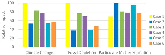 The sensitivity analysis (Figure 3 and Table 7), shows that instead of using the current UAE natural gas-based energy (Case 1) for the operation phase of DP1, using the modified UAE grid (Case 4) or further increase of solar energy (Case 2 and Case 5) and wind energy (Case 5 and Case 6) would have a positive impact on the midpoint categories climate change and fossil depletion but a negative impact on the category particulate matter formation. The increase in particulate matter due to the increase of nuclear energy, solar energy, and wind energy is due to the background data in Ecoinvent database that allocates the particulate matter emissions to the supply chains involved in the production of infrastructure of these technologies. In particular, the use of lignite-based energy in solar panel manufacturing and the use of oil-based energy for manufacturing the assets for wind-based and nuclear-based energy. The analysis further shows the importance of having different sources of energy in an energy mix because energy mix dominated by one source of energy (e.g., Case 1 or Case 2) may perform the best in once impact category but worst in the others either due to emissions in the use phase or the intensive infrastructure requirements. A comparison of Case 2 (100% solar energy) with Case 6 that includes 50% wind energy, respectively, highlights that even though Case 2 would save 46% carbon emissions w.r.t Case 1, inclusion of wind energy will not only save 43% carbon emissions w.r.t Case 1 but also 23% particulate matter w.r.t Case 2. The carbon emission along with the particulate matter emission from the current DP1 energy grid (Case 3) would reduce with the addition of nuclear energy into the energy grid of UAE (Case 4).