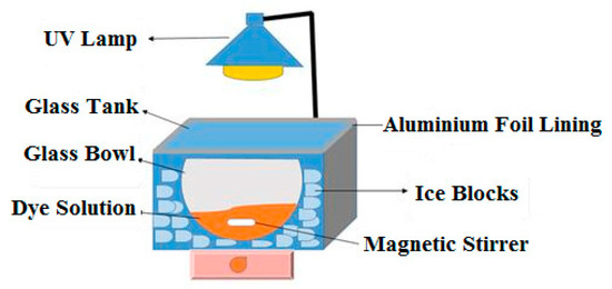 The experimental setup used for the photocatalytic removal of M.O at the applied conditions is presented in Figure 1. The system consisted of a Mega-Ray 160-W/240-V MR160 SPL11/14, UV lamp (with a wavelength of 465 nm) from Kimix, a thick 5-mm glass tank, which was lined on the inside with aluminum foil, a glass bowl containing M.O solution, which rested on ice blocks for system cooling, and a magnetic stirrer placed in the vessel to ensure the homogeneity of the solution during the photocatalytic treatment process. Beforehand, the absorbance of standard concentrations of (M.O) dye was measured, and the plot of absorbance vs. standard concentrations resulted in a linear trend according to Beer’s law: A = ε · C · l, where A = absorbance (no units), ε = molar absorptivity coefficient (units = L/mol cm), C = concentration of absorbing species (units = mol/L). and l = path length (units = cm). At the end of each timed photocatalytic experiment, UV-Vis spectroscopy was utilized as an immediate measure of absorbance. The linear calibration was then used to approximate the unknown concentration of (M.O) dye at each sampling time.
