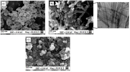 SEM Image of (a) TiO2 Degussa, (b) TiO2 nanotubes, and (c) TiO2 nanospheres at Magnification of 50.00 kX. and electron high tension (EHT) of 5.00 kV.