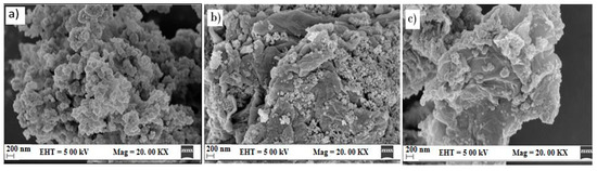 SEM analysis revealed the solid-state nature, as well as the intimate interaction between TiO2 and composite components. These are essential towards promoting photo charge transportation, as well as concentrating the organic substrate around TiO2. Figure 3a shows the morphological structure of the unmodified TiO2 Degussa catalyst at 20.00 kX. From the image, it is clear that the particles were agglomerated and roughly spherical in shape. Figure 3b shows spherically-shaped AgFe-TiO2 with good dispersion and approximately 15–25 nm in diameter. Research by Ranjit and Viswanathan [45] confirmed that the synergy of TiO2 with Fe (III) enhanced its photocatalytic activity. Figure 3c shows the rGO-AgFe-TiO2, where AgFe and TiO2 were completely infused with the rGO. Although the thicker catalyst may enhance light absorption, it also created a longer electron diffusion distance, which increased transport resistance and decreased photocatalytic activity. It is, therefore, speculated that photocatalysis would be carried out more efficiently with the AgFe-TiO2 (b) [46].