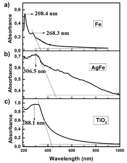 UV-Vis spectra for (a) Fe nanoparticles, (b) AgFe nanoalloy, and (c) TiO2 Degussa.