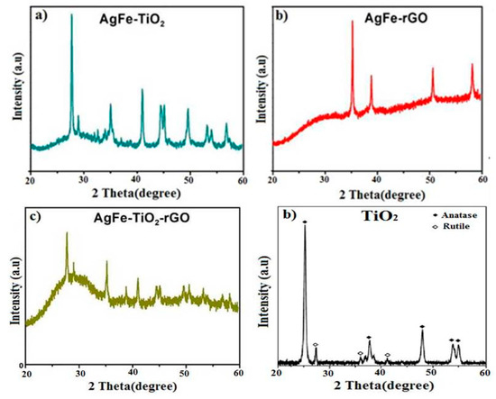 X-ray diffraction (XRD) patterns of (a) AgFe-TiO2, (b) AgFe-rGO, (c) AgFe-TiO2-rGO, and (d) TiO2 nanocomposites.