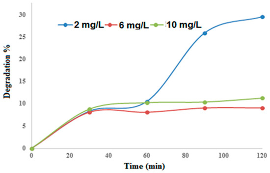 Effect of initial concentration on M.O degradation percentage. Varied parameters: dye concentration of 2, 6, and 10 mg/L, solution volume 500 mL, irradiation time 120 min.