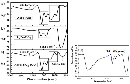 FT-IR spectra for nanocomposites (a) AgFe-rGO, (b) AgFe-TiO2, (c) AgFe-TiO2-rGO, and (d) TiO2.