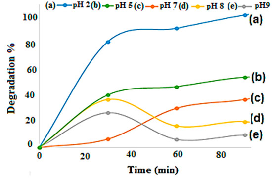 Solution pH is an important parameter for reactions taking place on the surface of a particulate, as is the case of TiO2 photocatalysis. Variations in pH can influence the adsorption of dye molecules on the TiO2 surfaces. Figure 9 presents the effect of solution pH on dye percentage removal at the indicated conditions. According to work done by Reza et al. (2017), the degradation percentage of the pollutant may increase with a decrease in solution pH [64]. The results in Figure 9 indicate that after 90 min of UV irradiation, the highest degradation percentage of methyl orange 98% was achieved at pH 2 followed by 50%, 35%, 20%, and 15% reached at pH 5, 7, 8, and 9, respectively. Due to excess anions in the solution, there will be repulsion of the dye by the negatively-charged surfaces of the adsorbents. Therefore, it is clear that the photocatalytic degradation rate of dye solution decreased with the increasing of the initial pH. These findings were in good agreement with work done by Sejie et al. (2016) and Niu (2013), who stated that the adsorption process was improved due to the stimulation of the adsorbent surface by the acid in solution at lower pH [65,66]. Concomitantly, in a similar study done by Milenova, K. et al. (2017), this behavior was stated to be influenced by the surface polarity, which contravenes the adsorption capacity [67]. A dye concentration of 4 mg/L and a solution pH of two were chosen as the optimum factors for the photochemical oxidation of M.O. These conditions were used to further assess the photocatalytic activity of TiO2 Degussa, TiO2 nanospheres, and TiO2 nanotube catalysts and their effect on the removal of M.O dye, respectively.