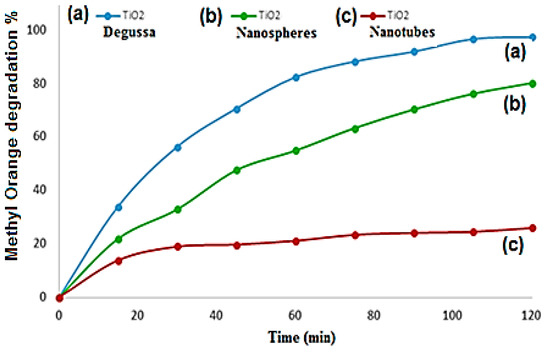Photocatalytic activity of TiO2 Degussa, TiO2 nanospheres, and TiO2 nanotubes on methyl orange degradation % at: pH 2, concentration 4 mg/L, amount of catalyst 0.01 g, and irradiation time 2 h.