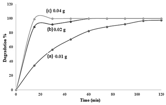 An increase of the catalyst concentration resulted in an increase of the amount of dye adsorbed on the catalyst surface, affecting the catalytic activity of the photocatalyst. Figure 11 presents the effect of photocatalyst dosage on M.O percentage degradation in convenient conditions. Within 2 h of irradiation, the degradation percentage of M.O increased with an increase in the amount of TiO2 Degussa catalyst. That is, the highest M.O removal was achieved with 0.04 g TiO2 Degussa, and complete degradation was reached after 60 min with 0.2 and 0.04 g TiO2. For instance, after 30 min of experiment, 56.38%, 91.57%, and 99.67% M.O removals were achieved with 0.01 g, 0.02 g, and 0.04 g, respectively.