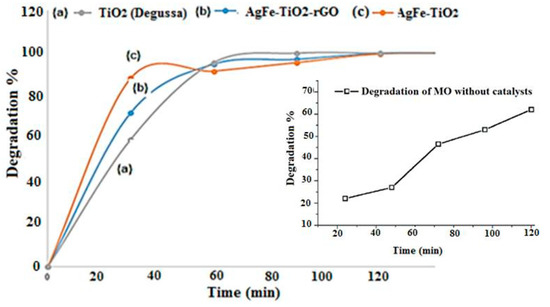 Photocatalytic activity of various catalysts including TiO2 Degussa, AgFe-TiO2-rGO, and AgFe-TiO2 on the degradation percentage of M.O (inset: MO degradation in the absence of catalyst).