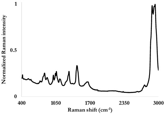To both confirm the presence of fluorine and to obtain a more accurate insight on the composition of these fluids, its Raman signature is established as our reference. Raman spectroscopy is a non-destructive and cost-effective technique to analyze materials and aqueous solutions [,]. The reference spectrum was obtained using an RXN-2 Raman spectrometer from Kaiser Optics, operating with a 785 nm laser source (red) with a 400 mW output, and a spectral resolution of 1 cm−1. Such a wavelength was chosen to avoid the spectral signature of water, as it would be the case with a laser at 532 nm. The Raman spectrum (Figure 1) was measured with a sample of 5 mL of the fluid placed into a quartz cell, with an integration time of 30 s. The spectral ranges of interest are between 600 and 1400 cm−1 for the chemical bonds involving fluorine, and in the 1000–1500 cm−1 and the 2800–3000 cm−1 for the ones involving ether covalent bonds [] (Table 2).
