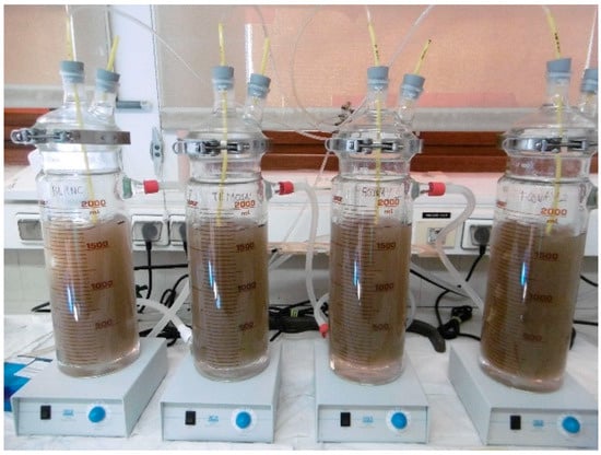 The method selected in this study is related to the standard referenced as NF EN ISO 9888, which evaluates the ultimate aerobic biodegradability of organic compounds in aqueous medium and in static conditions (the Zahn–Wellens method) []. It is similar to the measurement of dissolved organic carbon in a static aerobic environment with constant air flow, temperature, stirring and light, through the appreciation of the chemical oxygen demand instead of the one of dissolved organic molecules. This process describes the degradation of the whole organic carbon present in an environmental matrix.