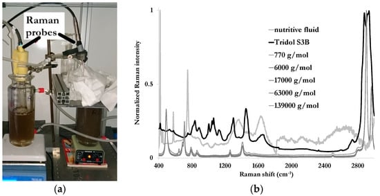 Once the limit of detection is established, a similar experimental setup to the one for the determination of the biodegradation based on the OECD 301 F protocol was developed. A spectroscopic monitoring was then implemented to specifically determine the environmental fate of one fire-fighting foam containing a polyfluoroalkyl ether. Two 1 L-reactors containing a static aerobic media with some nutriments and an inoculum were then prepared. One was used as a reference, while 10 mL of pure Triodol S3B were added into the second one. A Raman immersion probe was placed into each reactor (Figure 3a), and was connected to the Kaiser RXN-2 Raman spectrometer to a continuous monitoring over 28 consecutive days. Each probe made a measurement for 30 s, with a 15 min-interval between each Raman spectrum. Some foam is naturally generated while stirring the mixture (nutritive fluid and inoculum) containing a fire-fighting foam, and some paper cloth was placed around the reactors to prevent any eventual overflow. To reduce the risk of foam occurrence, five specific trimethylsiloxy-terminated polydimethylsiloxanes were added, with molar mass ranging from 770 g/mol to 139,000 g/mol, these chemicals making the foam unstable and are widely used in food industry. Normalized Raman spectra of the fluids present in the environmental matrix are provided in Figure 3b.
