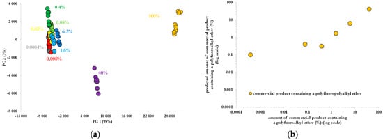 Principle component analysis (PCA) applied to Raman spectra of diluted aqueous solutions of a fire-fighting foam (a) and Partial Least Squares (PLS) model to predict the amount of fire-fighting foam Tridol S3B containing a polyfluoroalkyl ether (b).