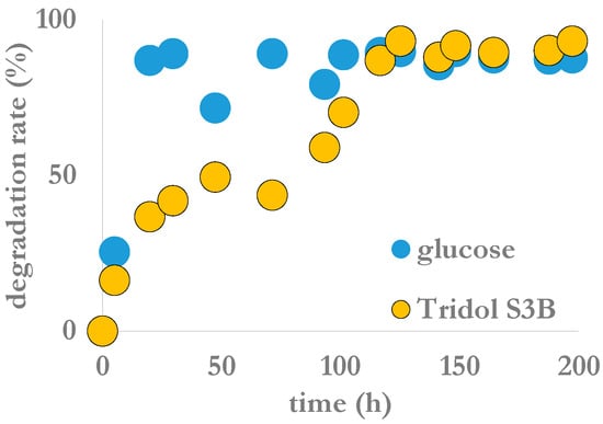 Biodegradability results are presented in Table 3. According to these test results, the product is easily degradable. Evolutions as a function of time of the degradation of this fire-fighting foam is in Figure 5. No significant difference was observed between it and two other tested fire-fighting foams. They all presented a pause between the 48th and 72nd h depending on the product after the beginning of the degradation process. Nevertheless, and as indicated before, this process describes the degradation of the whole organic carbon present in the environmental matrix. In the case of Tridol S3B, it includes at least ethylene glycol, 2-(2-butoxyethoxy)ethanol, alkyl sulfate, ethanol and polyethylene glycol 400, besides polyfluoroalkyl ethers. Therefore, this test did not indicate to what extent fluorinated organic molecules, considered as persistent into the environment, were really degraded, or not.