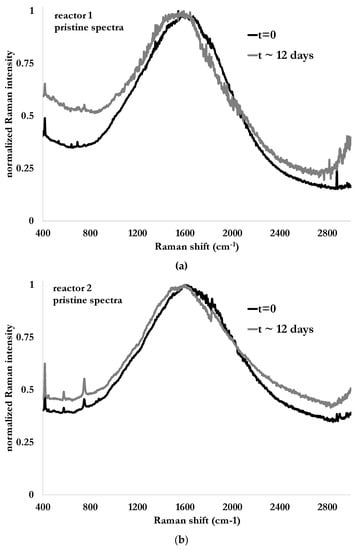 Raman spectra from both reactors are illustrated in Figure 6a,b for the case of Tridol S3B, at the beginning of the test (dark solid line) and after 288 h (12 days) of biodegradation (gray, solid line). The first element to notice is the strong fluorescence due to the light diffusion already present in the nutritive fluid and enhanced by the solid particles in suspension and causing the turbidity of the studied media. The second one is the presence of peaks at 580 cm−1 and 750 cm−1 in the Raman spectra of the fluid containing the fire-fighting foam. These peaks can be attributed to CFx bonds (x = 1, 2 or 3) []. The peak near 580 cm−1 was barely visible in the case of pristine fire-fighting foam. Thus, the presence of such a peak could be the evidence that the fluorinated molecules are still present while the degradation process is supposed to be almost over, as indicated in Figure 5 when evaluating it conventionally. Since these peaks are also present in the nutritive fluid, additional investigations are needed.