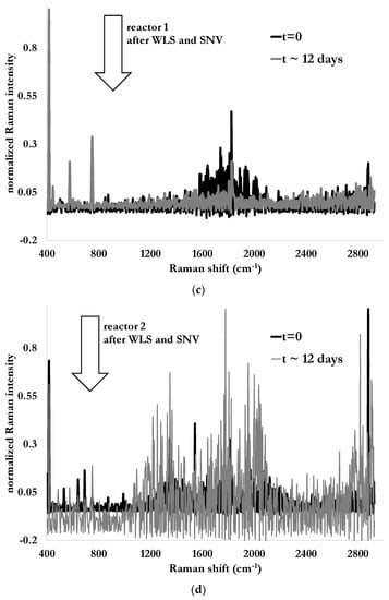 Raman spectra in their pristine form obtained at the beginning of the test and after 12 days from immersion probes in reactors without fire-fighting foam (a) and with 10 mL of fire-fighting foam Tridol S3B (b), and the same respective Raman spectra after Singular Normal Variate (SNV) and baseline corrections (Whittaker filter) (c,d).