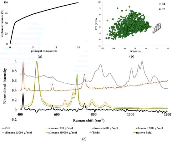 PCA was first conducted on the data set constituted of spectra from both reactors, with a calculation based on 15 principal components on the 400–1200 cm−1 spectral range. The first principal component explained nearly 49% of the variance, and the second close to 9%, the total explained variance by the 15 principal components being over 99% (Figure 7a). The scores plot generated by these first two principal components is illustrated in Figure 7b. One can observe that the data points from each reactor are separated by the first principal component. Data from reactor 1 only containing the environmental matrix was gathered, indicating a system almost unchanged along the selected duration of the test. Data points from reactor 2 (in green in Figure 7b and containing the fire-fighting foam) are globally spread along this first principal component, and converge towards the ones of reactor 1 without reaching it. The first loadings (Figure 7c) were plotted along with the Raman spectra of Tridol S3B, siloxanes and nutritive fluid. Peaks related to nutritive fluid at 580 cm−1 and 750 cm−1 were clearly identified. This component has a loading profile similar to the reference spectrum of the nutritive fluid, which is common to the two reactors (cf. Table 2). In the scores plot, the two data sets are nevertheless separated by this principal component. Therefore, data analysis indicated a difference which occurred in the nutritive fluid. A selectivity issue is then raised, and these peaks could both be attributed to nutritive fluid and Tridol S3B.