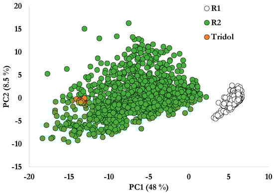 To overcome this selectivity issue, a new PCA was then conducted on the data set constituted of spectra from both reactors and the ones of a pure fire-fighting foam, with the same data pre-processing and the same spectral range as before for consistency’s sake. A new scores plot was then generated with the first two principal components (Figure 8) respectively explaining 48% and 8.5% of the variance. Here again the whole data set is organized into two groups, with data points from reactor 1 still separately grouped, while points relating to pure Tridol S3B are mixed with the points of reactor 2. The ones of reactor 2 are still dispersed and converging towards the ones of reactor 1. Therefore, peaks at 580 cm−1 and 750 cm−1 in the first principal component are related to Tridol S3B, and not exclusively to the nutritive fluid. This indicates that the biodegradation of this fire-fighting foam is incomplete.