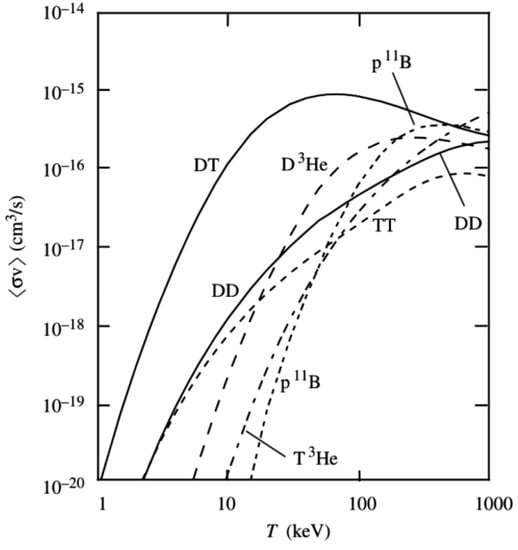 In this context, the term “nuclear fusion systems” refers to machines that are sometimes commercial but mainly experimental. Commercial devices are essentially the so-called “neutron generators” that are used in research, logistics, security, healthcare, and industry. The neutron generators use the fusion reactions described above, mainly the D-T one due to the more favorable conditions of reaction. The D-T reaction has by far the largest reactivity even at “low” energies, of the order of hundreds of keV, as shown by the graph in Figure 1, which compares the D-T reaction reactivity with other fusion reactions [2]. D-T reactivity is maximum at about T = 64 keV and for plasma temperature below 60 keV is at least 10 times larger than the reactivity of any other reaction.