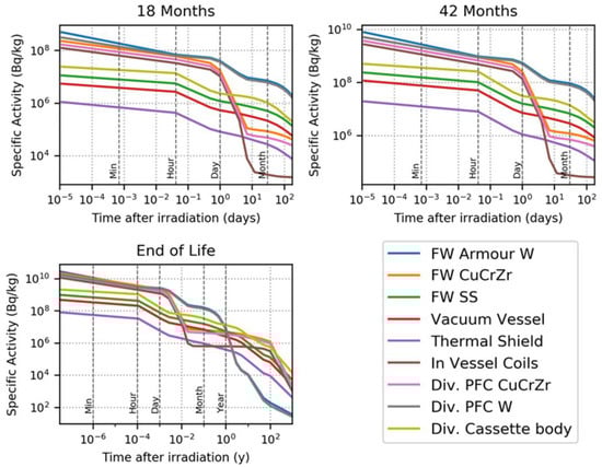 An example of the radioactive inventory that can be found in operating plants is shown in Table 5 and Table 6 from a study conducted for the NBI device [4], where D-D reactions occur, developed in Italy, and then used for ITER. Figures refer to different waiting times after the shutdown and the lower number of surviving radionuclides can be easily noticed in the second case. The radioactive elements are actually the same as those shown in Table 3 and Table 4, which are of a general nature. In some cases, it may be useful to refer to the integral result that indicates total radioactivity following activation. Figure 3 indicates the theoretical result [5] obtained with calculation codes related to the activation of the parts inside the vessel of DTT, where neutrons from D-D reactions dominate. The graphs shown refer to different phases of the machine’s operation, indicating the integral activity for the components, depending on the cooling time after the end of the activity. For example, it may be noted that at the end of the DTT operations it takes several tens of years to reach radioactivity concentrations of less than 1 Bq/g. Otherwise, some components removed during the working life of the machine fall below the same concentration in a few months.