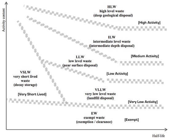 Radioactive waste classification as IAEA General Safety Guide 1. In square brackets the Italian definition. HLW: high level waste, ILW: intermediate level waste, LLW: low level waste, VLLW: very low level waste, VSLW: very short lived waste, EW: exempt waste.