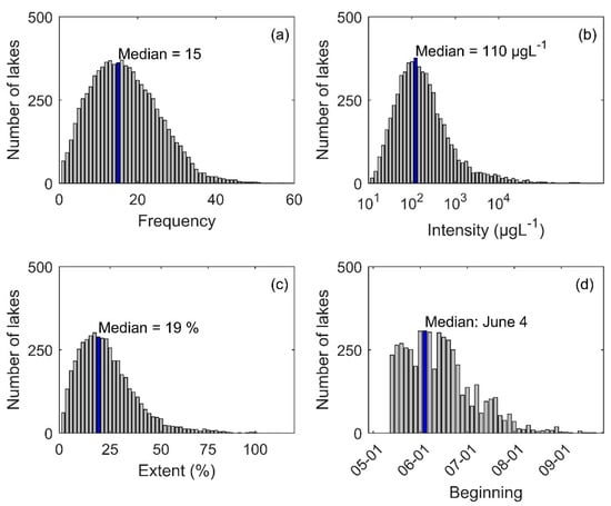 | Frequency (x1,1) | Intensity (x1,2) | Surface Area (x1,3) | Onset Date (x1,4) | Lake Area (x2,1) | Lake Shape Index (x2,2) | Watershed Area (x2,3) | Watershed Shape Index (x2,4) | Slope (x2,5) | Forest (x2,6) | Settlement (x2,7) | Cropland (x2,8) | Population Ecumene (x2,9) | Agriculture Ecumene (x2,10) | Precipitation (x2,11) | Temperature (x2,12) | Degree-Days (x2,13) | Wind Speed (x2,14) | |
