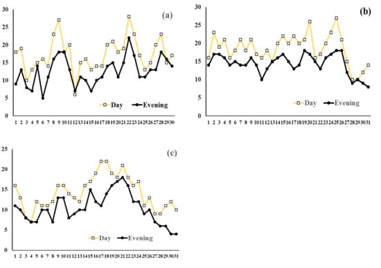 Temperature dynamics for the summer period of 2019 in the vicinity of Syktyvkar: (a) June, (b) July, and (c) August. The ordinate axis is the Celsius scale.