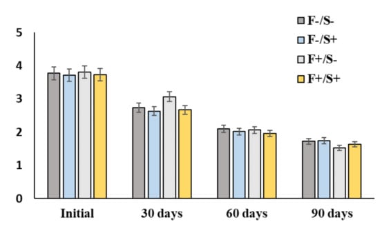 This experiment revealed that during the first 30 days in natural conditions, the TPH decomposition was 30 ± 5% (Figure 2). On days 60 and 90, the TPH decomposition process was 45 ± 5% and 60 ± 5%, respectively. The values of TPH concentration in initial samples (before introduction petroleum) were not more than 0.3 mg/g, and hence were not taken into consideration. It should be noted that heavy petroleum was used in the work. In the calculations, only heavy non-volatile petroleum fractions were taken into account, except for tar and asphalt. It was revealed that the introduction of various stimulating additives has an insignificant effect. As a result, no reliable differences (p > 0.05) were found in the rate of TPH reduction between different bio-stimulation options.