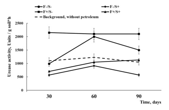 Petroleum contamination causes a qualitative reorganization of the microbial community, and in some cases an increase in the number of specialized oil-oxidizing microorganisms [,]. An increase in the activity of catalase, dehydrogenase, peroxidase, and polyphenol oxidase is observed [,,]. One of the important biogenic elements is nitrogen, which plays a key role in the formation of the biomass of living organisms. Nitrogen metabolic enzyme activity is an important diagnostic indicator of the intensity of soil nitrogen mobilization processes. It has been noted that urease activity increases with average and sometimes strong petroleum pollution [], while it decreases with very strong petroleum pollution. However, another study [] revealed a decrease in the urease activity, which can be influenced by the type of polluting oil, quantity, and type of soil. All these observations suggest that urease activity can be used as a biodiagnostic indicator of petroleum-contamination soils and as a criterion for self-cleaning for various stimulation methods [].