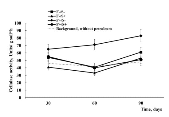 As the objects of the study were soils containing plant residues, it was expedient to check cellulase activity at various stages of ex situ remediation. Cellulose-destroying microorganisms, which are specific producers of cellulases, can react sensitively to petroleum contamination. Depending on the amount of oil, cellulolytic microorganisms remain in a depressed state for a long time after contamination []. Therefore, the activity of soil cellulases may serve as an indicator of soil conditions at different stages of self-cleaning as well as after remediation measures.