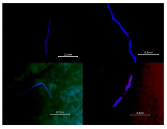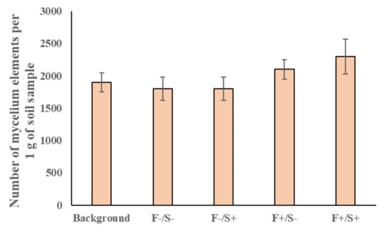 For counting the mycelium of microscopic fungi on a Mikmed 2 (version 11) fluorescent microscope, method [] was used with some changes (camera—RisingCam E3 Sony IMX226 12 MP; software—RisingView. Microscope objective was 40x. After preparing the soil suspension (1 g of soil per 100 cm3 of water), samples were taken in triplicate and the necessary dilution was carried out. Then, without waiting for sedimentation, 3 cm3 of the diluted sample was filtered through a microporous filter with a pore size of 0.2 μm. The counting was carried out over the entire filtration area in the long-wave ultraviolet range. The excitation wavelength was λ = 360 nm, and the fluorescent components of the mycelium were counted in the fluorescence range λ = 400–440 nm. In this case, no specific dyes were used. The calculation was carried out in units of mycelium fragments per 1 g of soil. As a result, the average value of three tests was taken.