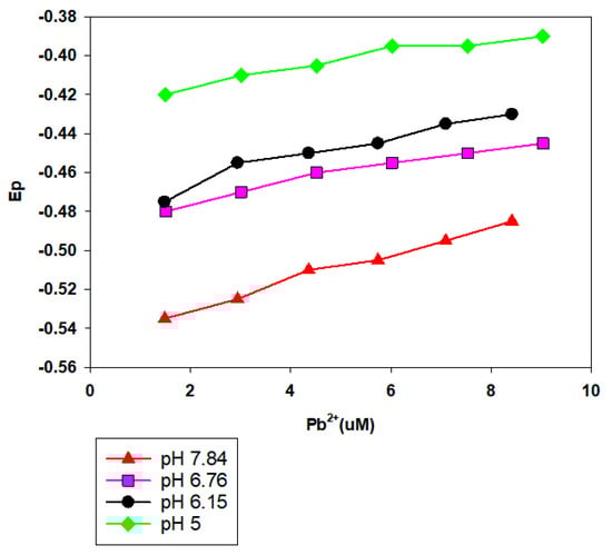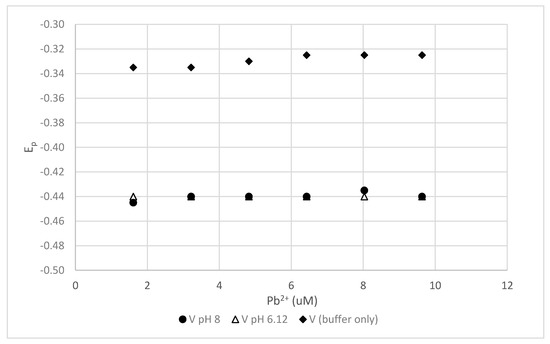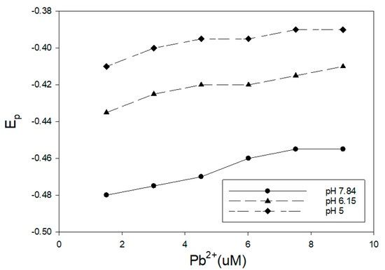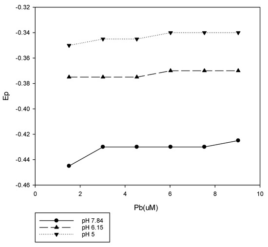 3,4-dihydroxybenzoic acid was utilized in this study as a proxy for humic materials. The effect of this organic acid on the reduction of Pb2+ (2–10 uM) was examined at three different pH values, and the results are presented in Figure 1. The concentration of 3,4-dihydroxybenzoic acid was 1.25 mM for all of these measurements. This ligand has been reported to react with various metals through the ring hydroxyl groups [26]. The pH of the solution was maintained with 1 mL of buffer in 15 mL of sample. The impact of this ligand and pH on the reduction of Pb2+ is clear. The pH 5 sample showed minimal shift from the reduction potential of uncomplexed Pb2+, and the observed Ep was very close to a ligand-free buffer solution. Measurements at pH 6.15 and 7.84 showed a shift toward a more negative voltage. The greater shift for the pH 7.84 measurements was consistent with the increased ionization of the ring hydroxyl groups, making a complex formation more favorable. On the other hand, Khayat et al. [27] examined the interaction of 3,4-dihydroxybenzoic acid and Pb2+ using a potentiometric approach at much higher Pb2+ and ligand concentrations. In their study, a precipitate was formed at pH 3 to 4.5 that appeared to be consistent with the formation of a complex through the ionized carboxylic acid group. Khayat et al. [27] did note that the precipitate appeared to dissolve at a higher pH, with the possible formation of a strong complexation through the phenolic groups.