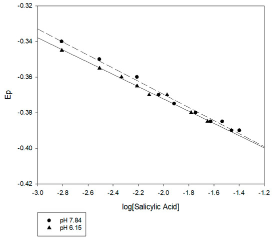 Salicylic acid has been used by other investigators as a low molecular weight humic acid analog [23,24,25]. The effect of salicylic acid on the reduction of lead was, therefore, investigated. Since the sodium salicylate is fairly soluble, it was possible to vary the concentration over a fairly large concentration range and, therefore, test the prediction of the Lingane equation.