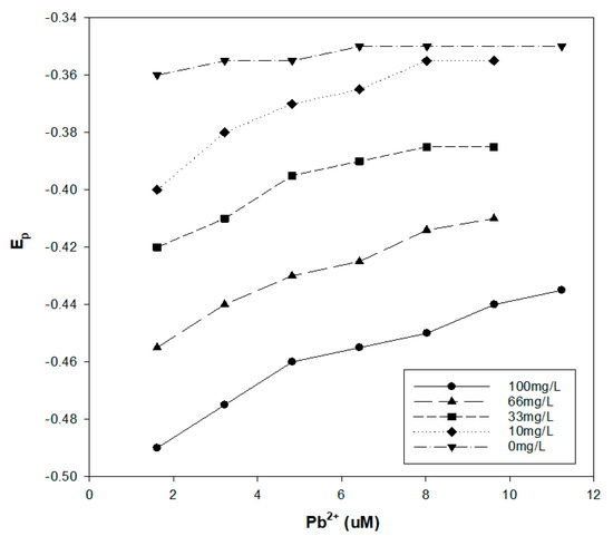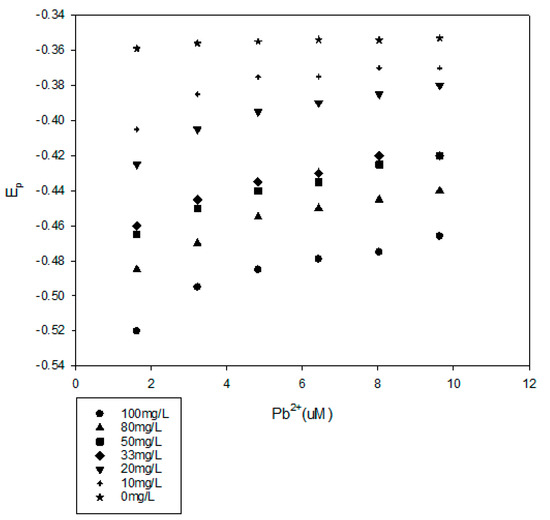 The Pahokee peat humic acid and Pb2+ interaction was examined at four different pH values and at different Pb2+ concentrations. The Pahokee peat humic acid concentration was 100 mg/L, and the results are presented in Figure 4. As expected, the impact of humic acid on the Ep for Pb2+ increased with the pH, which increased the ionization of the humic acid and the availability of metal complexing ligands. It was also noted that the shift in Ep decreased as the Pb2+ concentration in the solution was increased. This concentration dependence for Ep indicates that there is a spectrum of binding interactions of Pb2+ with the humic material, with the more stable complexes formed at low Pb2+ concentrations. We also observed that the shift in the Ep was a function of the concentration of humic acid (Figure 5).
