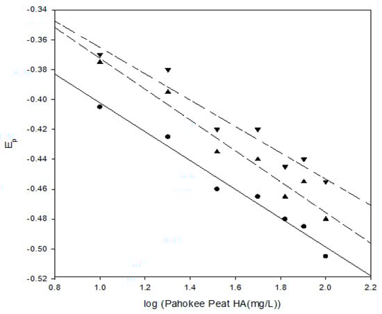 The measurements of Ep made during this investigation can be used to estimate a value for ΔE. If the concentration of the ligand (L) and p are available, it is then possible to estimate the value of KL. If the natural abundance and stoichiometry of the complexing groups on the humic material were well-characterized, it would be possible to estimate the magnitude of the stability constant for a complex formation for Pb2+ with the humic material. It is tempting to use the dissociable proton content of humic materials as an estimate of the abundance of complexing groups; however, past research has indicated that not all of these groups are available to complex metals [3,16,17]. Furthermore, many of the humic substance-binding sites are likely to be multidentate, and some binding may involve the nonspecific accumulation of counter ions in the vicinity of the negatively charged humic substance [3,18,19,20].
