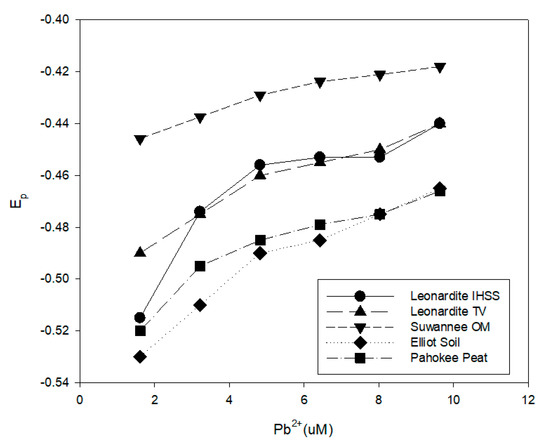 Using the stability constants imbedded in Visual Minteq [21] and the conditions of these experiments, we calculated the speciation of Pb2+. At pH 8, and in the absence of humic matter, Pb2+ would exist primarily as Pb2+, PbOH+ and Pb(OH)2 (44.7%, 53.9% and 1.31%), respectively. The HEPES, MOPS and PIPES buffering agents utilized were selected because of their minimal interactions with metal species and should not impact this distribution [22]. The shift in Ep that we measured represents a change in Pb2+ speciation, where there is some hydrolysis to a ligated form of Pb2+. The ligated species may be mono- or multidentate and could involve mixed ligand complexes as well.