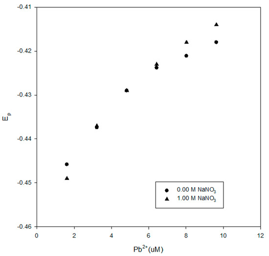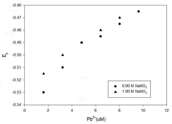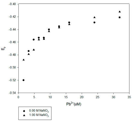 Measurements at two different pH values are summarized in Figure 2 and illustrate that the salicylate complexation can shift the reduction potential for Pb2+ to more negative values. It is interesting that the Ep at pH 6.15 and 7.84 are very close. This observation possibly indicates that the phenolic hydroxyl group of salicylic acid does not ionize when the Pb2+ salicylate (Sal) complex forms. The shift in the Ep increased with the logarithmic concentration of salicylic acid in the solution, as predicted by the Lingane equation. The slopes of the two lines are 34.4 and 36.8 mV/log (Sal), respectively. This differs from the slope predicted by the Nernst equation (29.6 at 25 °C) but is still reasonably close. There are very few measurements of the stability constants between salicylate and Pb2+ in the literature. Furia and Porto [28] investigated the interaction of Pb2+ with hydrogen salicylate using potentiometric titration. These investigators measured the stability constants at a rather high ionic strength (3-M KClO4) and extrapolated the constant to 0 ionic strength. Their results indicated that, at pH 7.84, PbSal and Pb(Sal)22− should be the dominant species. Using the Furia and Porto [28] stability constants and a variant of the DeFord Hume equation [29,30,31], which is similar to the Lingane equation, we calculated that the shift in reduction potential should be closer to a factor of two times greater at pH 7.84 than what we observed. Furthermore, there should be a significant difference between pH 6.15 and pH 7.84. The calculation indicated that the shift for pH 7.84 should be about four times greater than for pH 6.15. Clearly, the salicylate ligation of Pb2+ requires additional investigation.