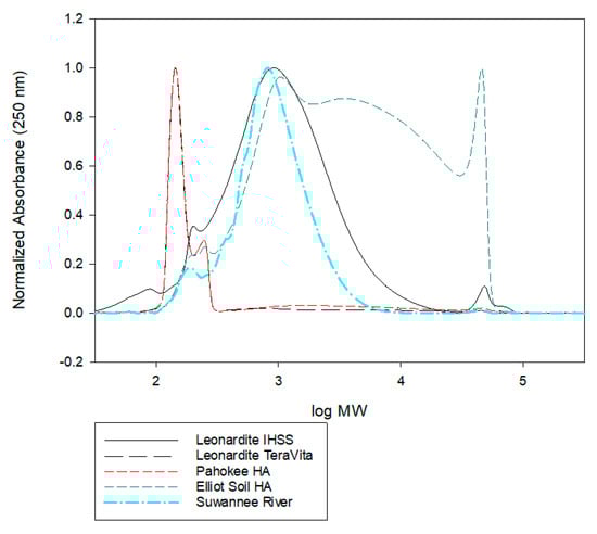 The results from size exclusion chromatography of the various humic materials are shown in Figure 13. The number-averaged (Mn) and weight-averaged (Mw) molecular weights derived from the SEC are tabulated in Table 1. The most striking results are the large differences in number-averaged vs. weight-averaged molecular weights and that all of the samples had rather low average molecular weights and an overall very broad molecular weight distribution. Furthermore, all of the humic materials examined contained a large contribution from low molecular weight components. These observations are consistent with the results of other studies [36,37,38]. The Ep results did not show any apparent correlation with Mn or Mw of the humic substance.