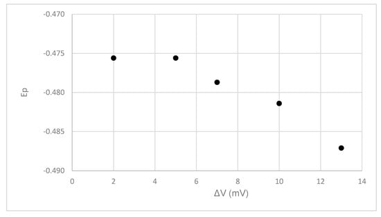 The influence of the DPP voltage increment (ΔV) on the Ep value. The results are shown for Pahokee peat humic acid at 100 mg/L at a pH of 8 and in the presence of 1.0-M NaNO3. The Pb2+ concentration was 4.8 uM.