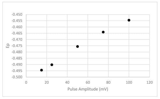 The influence of the DPP pulse amplitude on the Ep value. The results are shown for Pahokee peat humic acid at 100 mg/L and a pH of 8 and in the presence of 1.0-M NaNO3. The Pb2+ concentration was 4.8 uM.