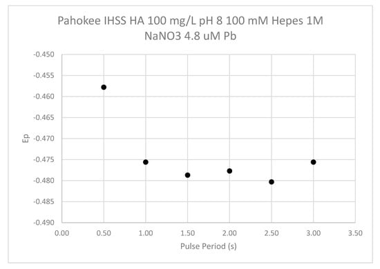 The influence of the DPP pulse period on the Ep value. The results are shown for Pahokee peat humic acid at 100 mg/L and a pH of 8 and in the presence of 1.0-M NaNO3. The Pb2+ concentration was 4.8 uM.
