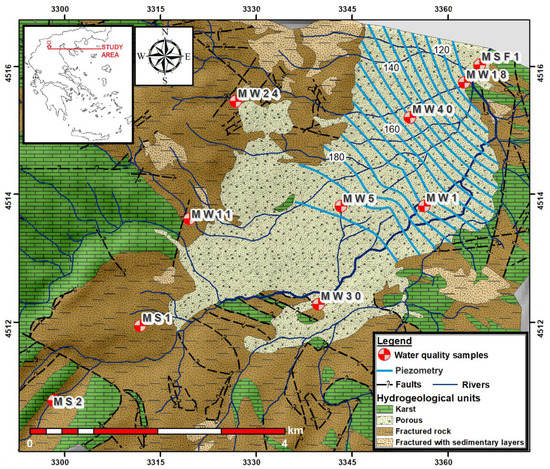 The study area chosen for this investigation is located in the southern part of the Pella prefecture (Northern Greece) covering an area of 78.08 km2 and with a perimeter of 40.97 km. It is mainly a rural irrigated area where all water needs are completely covered by the exploitation of ground and surface water resources. The local climate is generally characterized as continental [] with an annual precipitation (PCP) amount greater than 800 mm, which is well distributed throughout the year. Widespread farming activities represent the main economical income for the local population and the water need of the area is completely met by the local resources, or through the network of water wells belonging to the Local Organizations of Land Reclamation (LOLR) of Edessa. From a lithological point of view, the area is mainly covered by the Almopian flysch, in a smaller extent by the Kerasia-Kedrona limestones in the eastern part of the area and by the volcano-sedimentary of the ophiolitic range in the southern part. The Almopian subzone dominates the area, with the Pelagonical formations taking the western part. The units of the Almopian subzone that are located within the study area are the middle (Lykoi, Mesimeriou) and western ones (Kerasia, Kedrona). The categorization of the aquifers was made based on the geological formation of the study area and was finally divided into porous, karstic, and fractured types (Figure 1). The groundwater flow is mainly oriented from West to East, feeding the Mega Rema river, which represents the main discharge passage of the basin. The study area is known for the fruit production and is characterized by high agricultural activity (mainly trees of cherry, apricot, and peach). Moreover, livestock units characterize the research area and could be responsible for groundwater quality deterioration and pollution. It should also be mentioned that small industries are located in the research area.