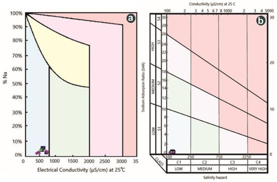 The overall water quality has been calculated using the GQI and graphic reoresentation. According to the Wilcox diagram (Figure 3a), the quality of the water samples is described from good to excellent. Moreover, the Richards diagram (Figure 3b) indicates that the groundwater is also suitable for agriculture purposes. To enforce the excellent groundwater status highlighted by the previous diagram, a GQI evaluation has been applied to assess the groundwater suitability for potable and irrigation use. The GQI has been calculated following the procedure proposed by Babiker et al. [] utilizing the available chemical parameters. In Table 2, the utilized threshold limits for potable (WHO) and irrigation use (FAO), along with the average calculated weights (R) of each parameters are shown.
