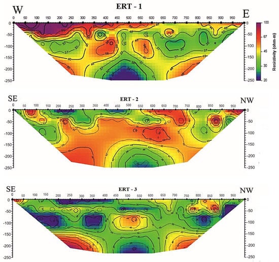 Electrical resistivity tomography (ERT) of the study area (from top to bottom, ERT1, ERT2, and ERT3 respectively).