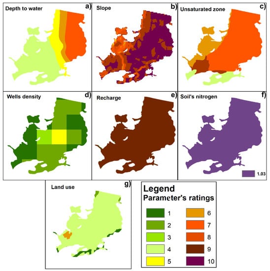 Protection from Natural and Anthropogenic (PNA) parameters spatial distribution for the study aquifer: (a) depth to water table map, (b) slope distribution, (c) unsaturated zone classification, (d) well density, (e) recharge distribution, (f) soil’s nitrogen map, (g) land use classification.