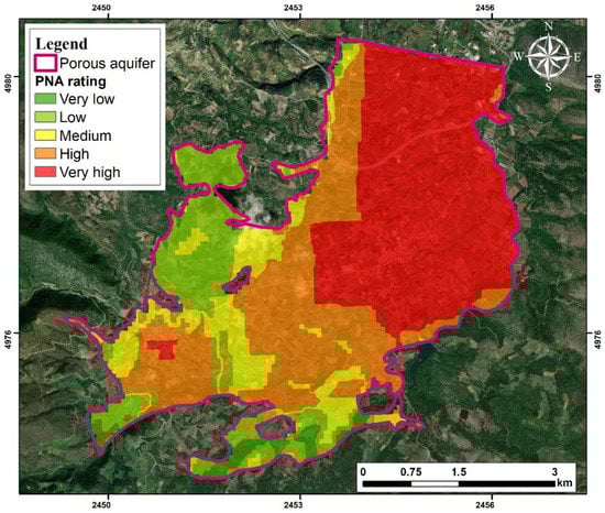 The PNA methodology considers a variety of available data to produce a NO3 vulnerability rating for a given region []. The parameters are divided into three categories: (i) P are the natural factors that influence NO3 pollution (depth to water, protection of the unsaturated zone, and slope), (ii) N are those factors that mainly affect NO3 infiltration into the groundwater (recharge + irrigation, nitrogen soil content), and finally (iii) A express the anthropogenic factors that can alter the rate of NO3 leaching into the aquifers (land use, irrigation, and well density). The final ratings of the methodology are calculated using the equation: