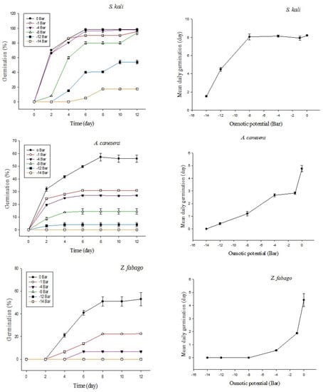 Germination (%) of S. kali, A. canescens and Z. fabago under different polyethylene glycol (PEG-6000) concentrations at different times (left) and mean daily germination of S. kali, A. canescens and Z. fabago under different PEG-6000 concentrations (right). Data represent means (n = 4) ± SE.