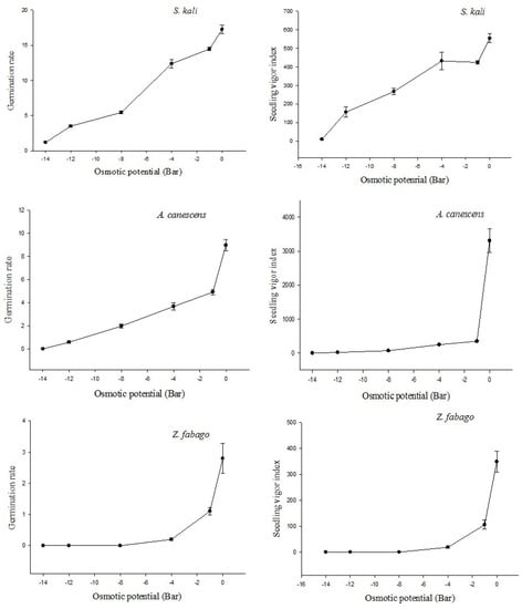 Drought is a major abiotic stress that seriously decreases crop productivity in arid and semi-arid environments [,,,,]. It has been reported that PEG decreases the water potential of osmotic solutions and thus can be used for drought stress studies. In our experiment, increasing PEG concentration adversely impacted seed germination and seedling growth of species, as a consequence of decreased water uptake []. Our results highlighted that S. kali seeds germinated well (>50%) at −12 bar. As a result, S. kali was tolerant to moistures stress at germination and thus is able to germinate in dryer areas. Under low water potential conditions caused by osmotic stresses like drought or salinity, some plants can efficiently accumulate various substances for osmotic adjustment (OA), and thus enhance the water absorption and retention capacity, which plays an important role in plants adapting to water-deficient conditions [,,]. The adaptations of this species to drought conditions make it a particularly invaluable species for use in the reclamation of degraded soils at risk of desertification []. In this study, there was no germination of Z. fabago seeds under −8, −12 and −14 bars, suggesting this species was not tolerant to drought stress at germination. In contrast, the germination of A. canescens was inhibited only at −14 bar. These results are in accordance with [], who found that osmotic potential of −10 and −12 bars completely inhibited seed germination in Brassica juncea but in the shrub species (Artemisia sphaerocephala), tolerated only −1.5 MPa PEG []. Reduction in seed germination percentage by water stress may be related to lower infusibility of water through the seed coat and initial water absorption by seeds under stress condition [,,].