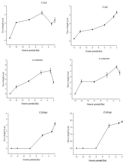 In absence of stress (control), A. canescens showed the highest shoot length (3.4 cm) followed by S. kali (3.27 cm), while Z. fabago presented the lowest one (1.8 cm) (Figure 3). At −1 bar, the highest shoot length (4.75 cm) was recorded in A. canescens and in this species, shoot length increased by 28% at −1 bar compared with non-stress control. Among species, S. kali was the only one able to develop shoots at −14 bar and Z. fabago showed the lowest shoot length (1.6 cm) at −14 bar, and failed to germinate at −8, −12 and −14 bars (Figure 3).
