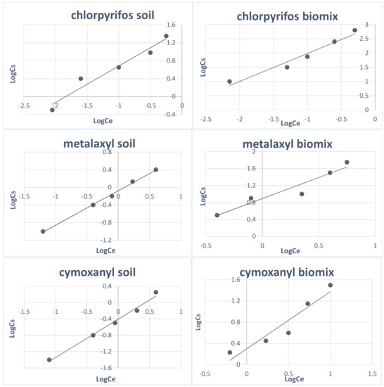The Freundlich exponent n increased in all cases from soil to biomix, indicating a higher affinity of the three pesticides for the substrate with a high organic carbon content.